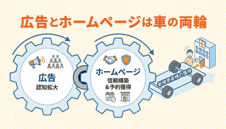 「広告」と「ホームページ」は車の両輪のような関係で、どちらか一方が欠けると、新規患者様の獲得はうまく進みません。
